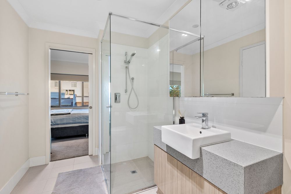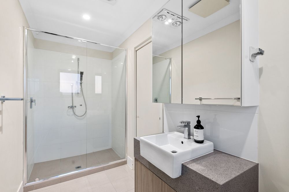A large semi-ensuite bathroom-come-laundry features a shower in the corner, a stone vanity, a toilet and corner linen cupboard, as well as heat lamps. It also runs off a commodious and carpeted master suite, complementing full-height mirrored built-in robes. At ground level, you will find two allocated car bays, as well as a handy storeroom that has been allocated to the apartment.