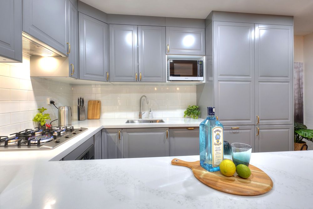 Stone benches in Kitchen and Laundry.