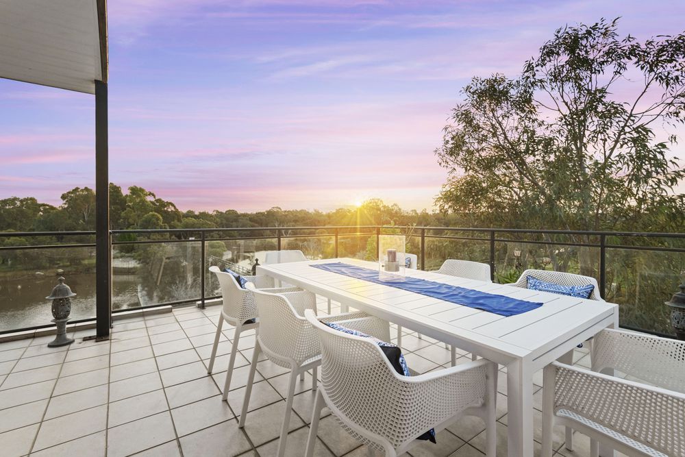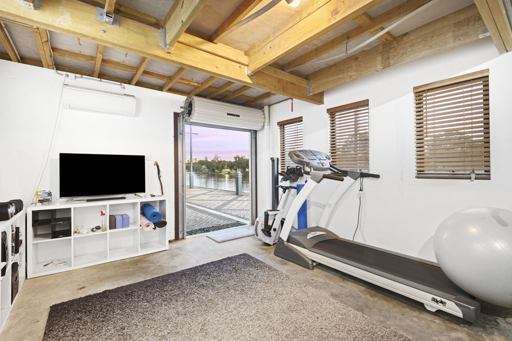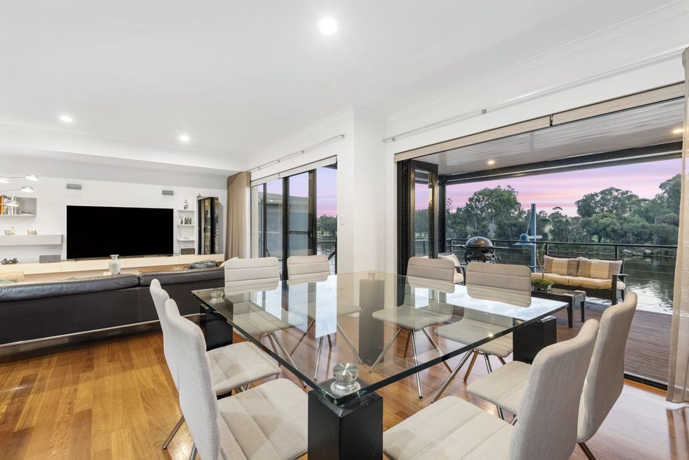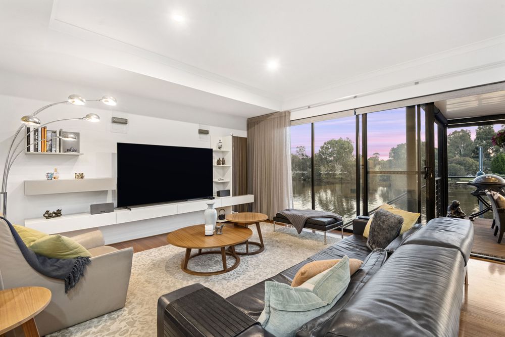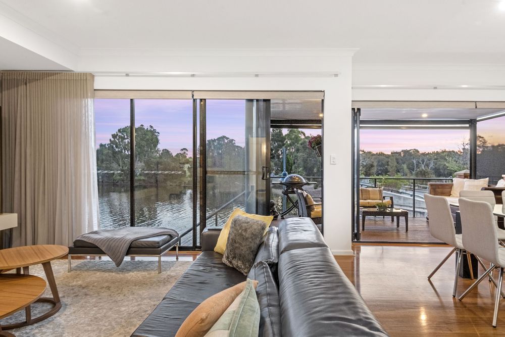 The kitchen is a chef's dream, featuring top-of-the-line appliances, ample storage space, and a stylish bench. The living room is bathed in natural light, thanks to large windows that offer breathtaking views of the river and surrounding nature.