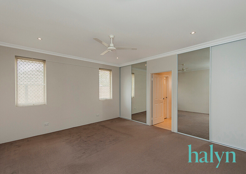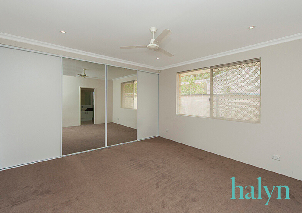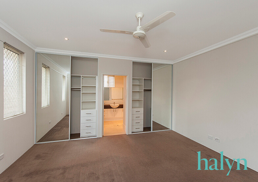 - Large carpeted master bedroom with his and her built in robes, ceiling fan and led lights